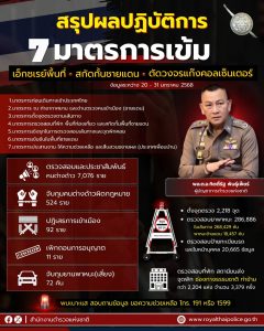 ผบ.ตร. กล่าวว่า ได้มีหนังสือสั่งการกำหนด 7 มาตรการเข้มข้น ให้ปฏิบัติอย่างชัดเจน โดยมีผลการปฏิบัติ ห้วงระหว่าง วันที่ 20-31 มกราคม 2568 ดังนี้