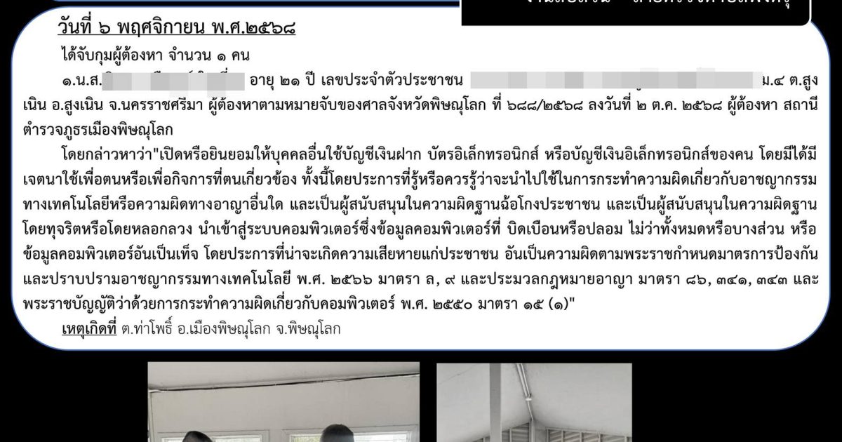 “เปิดหรือยินยอมให้บุคคลอื่นใช้บัญชีเงินฝาก บัตรอิเล็กทรอนิกส์ หรือบัญชีเงินอิเล็กทรอนิกส์ของคน โดยมีได้มีเจตนาใช้เพื่อตนหรือเพื่อกิจการที่ตนเกี่ยวข้อง ทั้งนี้โดยประการที่รู้หรือควรรู้ว่าจะนำไปใช้ในการกระทำความผิดเกี่ยวกับอาชญากรรมทางเทคโนโลยีหรือความผิดทางอาญาอื่นใด และเป็นผู้สนับสนุนในความผิดฐานฉ้อโกงประชาชน และเป็นผู้สนับสนุนในความผิดฐานโดยทุจริตหรือโดยหลอกลวง นำเข้าสู่ระบบคอมพิวเตอร์ซึ่งข้อมูลคอมพิวเตอร์ที่ บิดเบือนหรือปลอม ไม่ว่าทั้งหมดหรือบางส่วน หรือข้อมูลคอมพิวเตอร์อันเป็นเท็จ โดยประการที่น่าจะเกิดความเสียหายแก่ประชาชน อันเป็นความผิดตามพระราชกำหนดมาตรการป้องกันและปราบปรามอาชญากรรมทางเทคโนโลยี พ.ศ. ๒๕๖๖ มาตรา ล, ๙ และประมวลกฎหมายอาญา มาตรา ๘๖, ๓๔๑, ๓๔๓ และพระราชบัญญัติว่าด้วยการกระทำความผิดเกี่ยวกับคอมพิวเตอร์ พ.ศ. ๒๕๕๐ มาตรา ๑๕ (๑)”