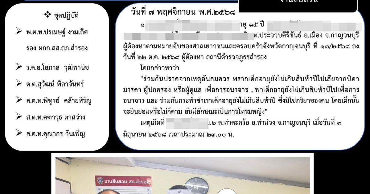 ผู้ต้องหาตามหมายจับของศาลเยาวชนและครอบครัวจังหวัดกาญจนบุรี ที่ 13/2568 ลงวันที่ 22 ต.ค. 2568 ผู้ต้องหา สถานีตำรวจภูธรสำรอง