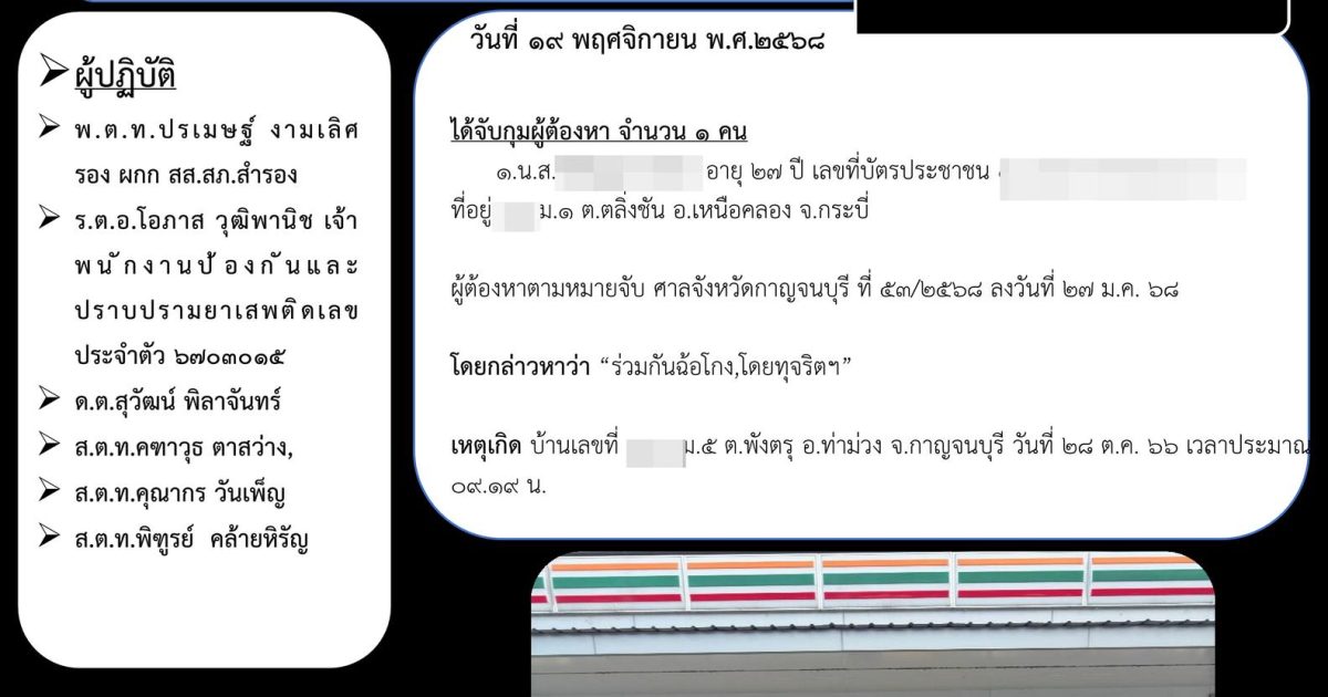 ได้ร่วมกันจับกุมตัวผู้ต้องหาตามหมายจับ ศาลจังหวัดกาญจนบุรี ที่ 53/2568 ลงวันที่ 27 ม.ค. 68