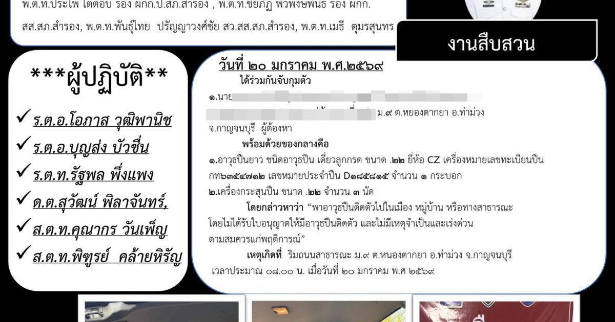 1.อาวุธปืนยาว ชนิดอาวุธปืน เดี่ยวลูกกรด ขนาด .22 ยี่ห้อ CZ เครื่องหมายเลขทะเบียนปืน กท6354xxx เลขหมายประจำปืน D185xxx จำนวน 1 กระบอก