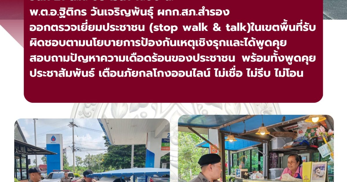 ออกตรวจเยี่ยมประชาชน (stop walk & talk)ในเขตพื้นที่รับผิดชอบตามนโยบายการป้องกันเหตุเชิงรุกเเละได้พูดคุยสอบถามปัญหาความเดือดร้อนของประชาชน พร้อมทั้งพูดคุยประชาสัมพันธ์ เตือนภัยกลโกงออนไลน์ ไม่เชื่อ ไม่รีบ ไม่โอน