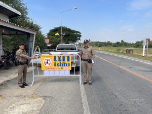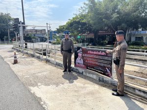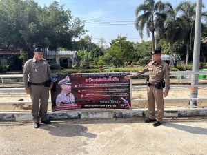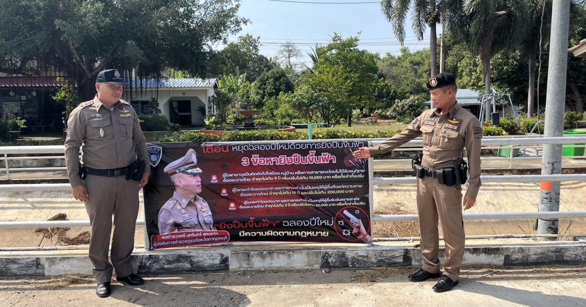 สถานีตำรวจภูธรสำรอง ติดตั้งป้ายร่วมรณรงค์ “เมาไม่ขับ” และป้ายเตือน หยุดฉลองปีใหม่ด้วยการยิงปื้นขึ้นฟ้า ในช่วงเทศกาลปีใหม่ 2568