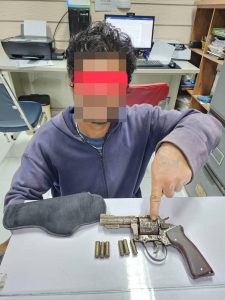 พร้อมด้วยของกลางมี 1.อาวุธปืนพกสั้น แบบรีวอลเว่อร์ (ลูกโม่) แบบไทยประดิษฐ์ ขนาด .38 ลำกล้องยาว 4 นิ้ว ไม่มีหมายเลขทะเบียน , ไม่มีหมายเลขประจำปืน จำนวน 1 กระบอก