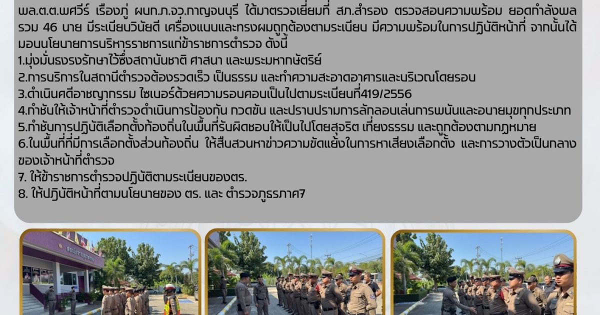 พล.ต.ต.พศวีร์ เรืองภู่ ผบก.ภ.จว.กาญจนบุรี ได้มาตรวจเยี่ยมที่ สภ.สำรอง ตรวจสอบความพร้อม ยอดกำลังพลรวม 46 นาย มีระเบียบวินัยดี เครื่องแบบและทรงผมถูกต้องตามระเบียบ มีความพร้อมในการปฏิบัติหน้าที่ จากนั้นได้มอบนโยบายการบริหารราชการแก่ข้าราชการตำรวจ ดังนี้
