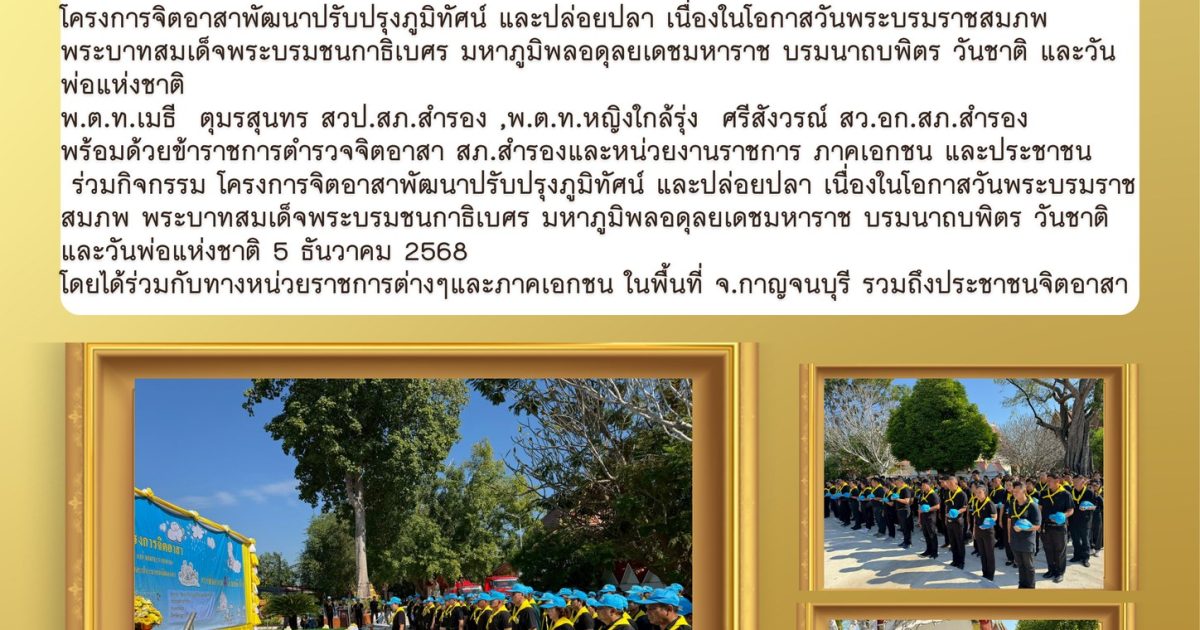 ร่วมกิจกรรม โครงการจิตอาสาพัฒนาปรับปรุงภูมิทัศน์ และปล่อยปลา เนื่องในโอกาสวันพระบรมราชสมภพ พระบาทสมเด็จพระบรมชนกาธิเบศร มหาภูมิพลอดุลยเดชมหาราช บรมนาถบพิตร วันชาติ และวันพ่อแห่งชาติ 5 ธันวาคม 2568 โดยได้ร่วมกับทางหน่วยราชการต่างๆและภาคเอกชน ในพื้นที่ จ.กาญจนบุรี รวมถึงประชาชนจิตอาสา