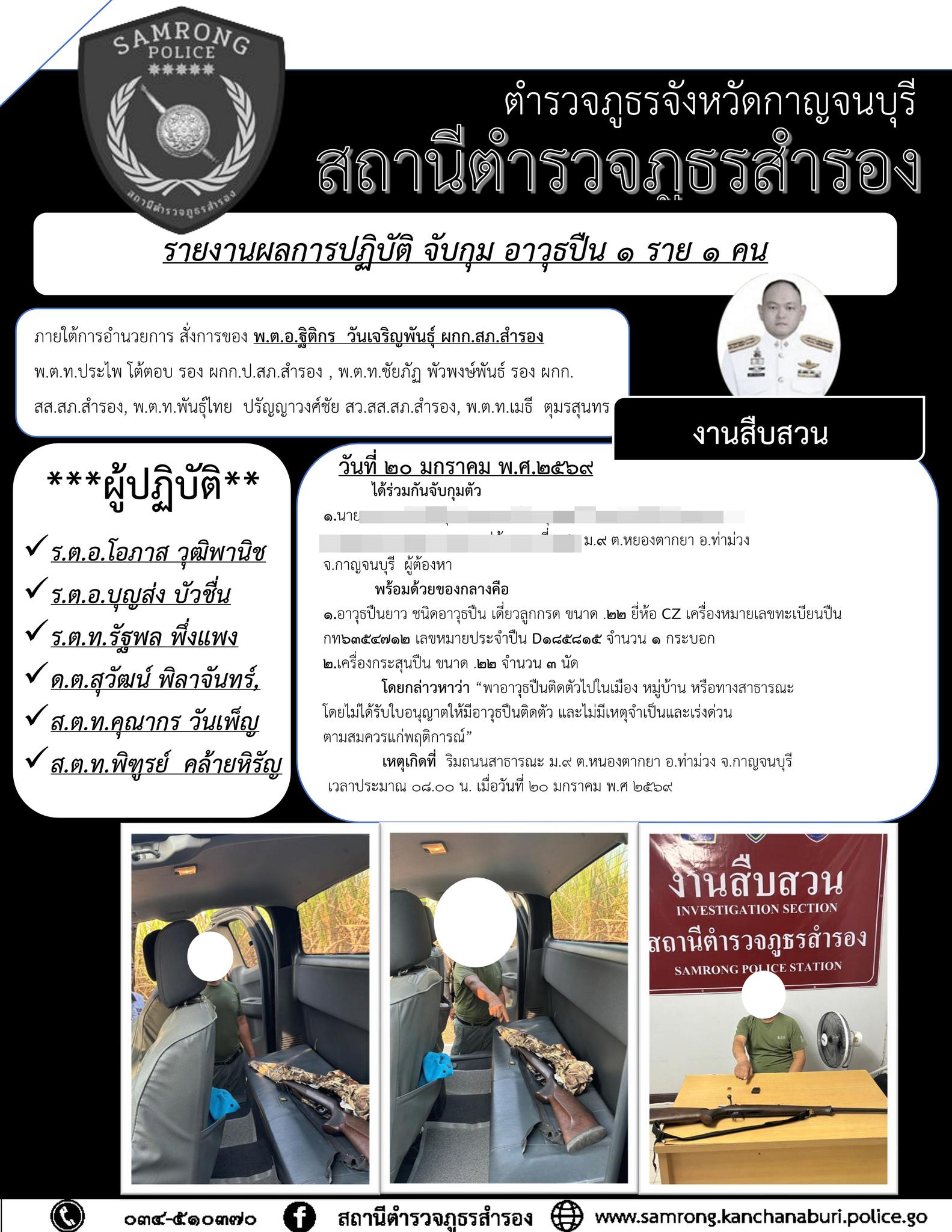 วันที่ 20 ม.ค. 69 เวลาประมาณ 08.00 น.สภ.สำรอง/จับกุม อาวุธปืน 1 ราย 1 คนสั่งการให้เจ้าหน้าที่ตำรวจ ส