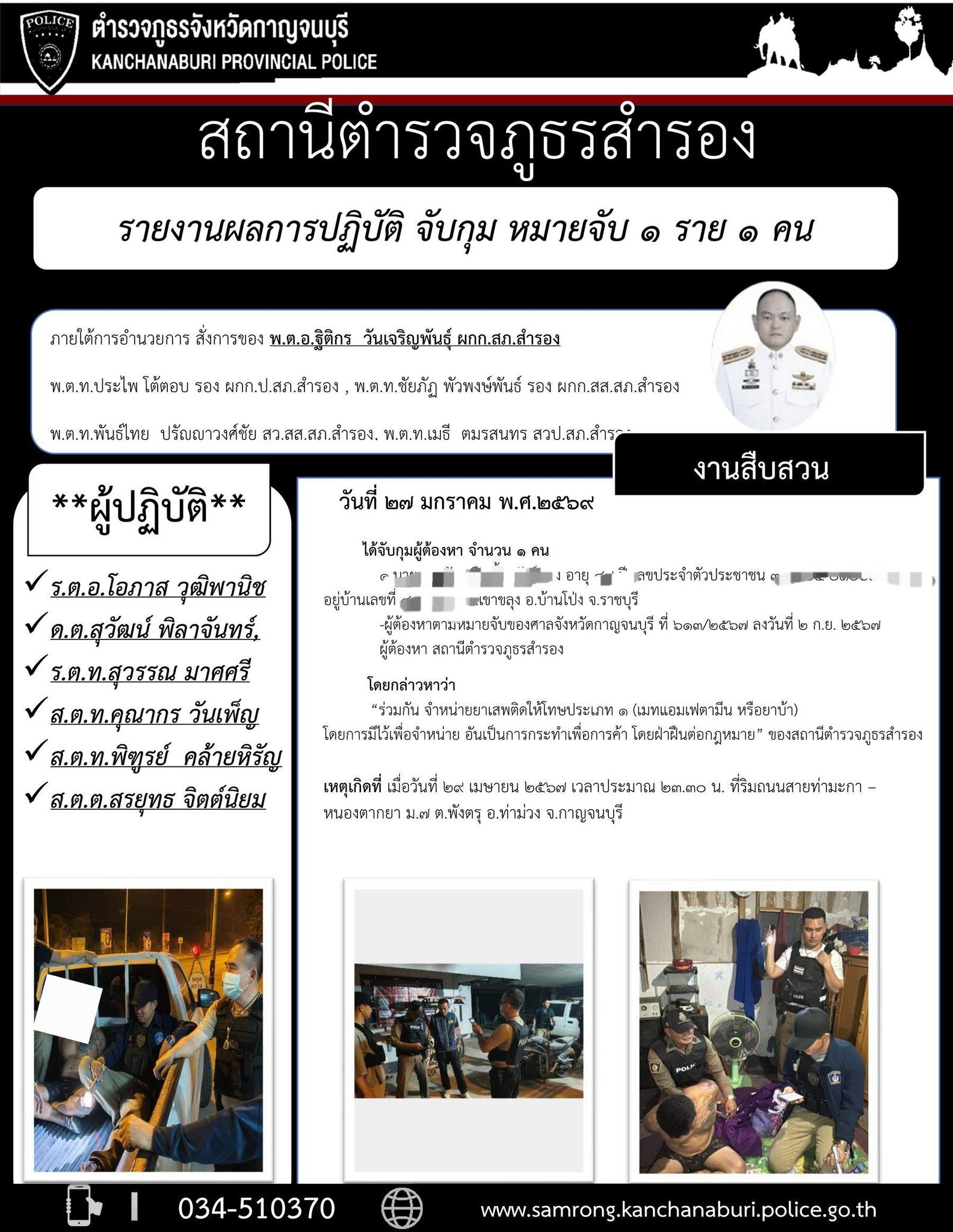 วันที่ 27 ม.ค. 69 เวลาประมาณ 01.00 น.สภ.สำรอง/จับกุม หมายจับ (ยาเสพติด) 1 ราย 1 คนได้จับกุมผู้ต้องหา