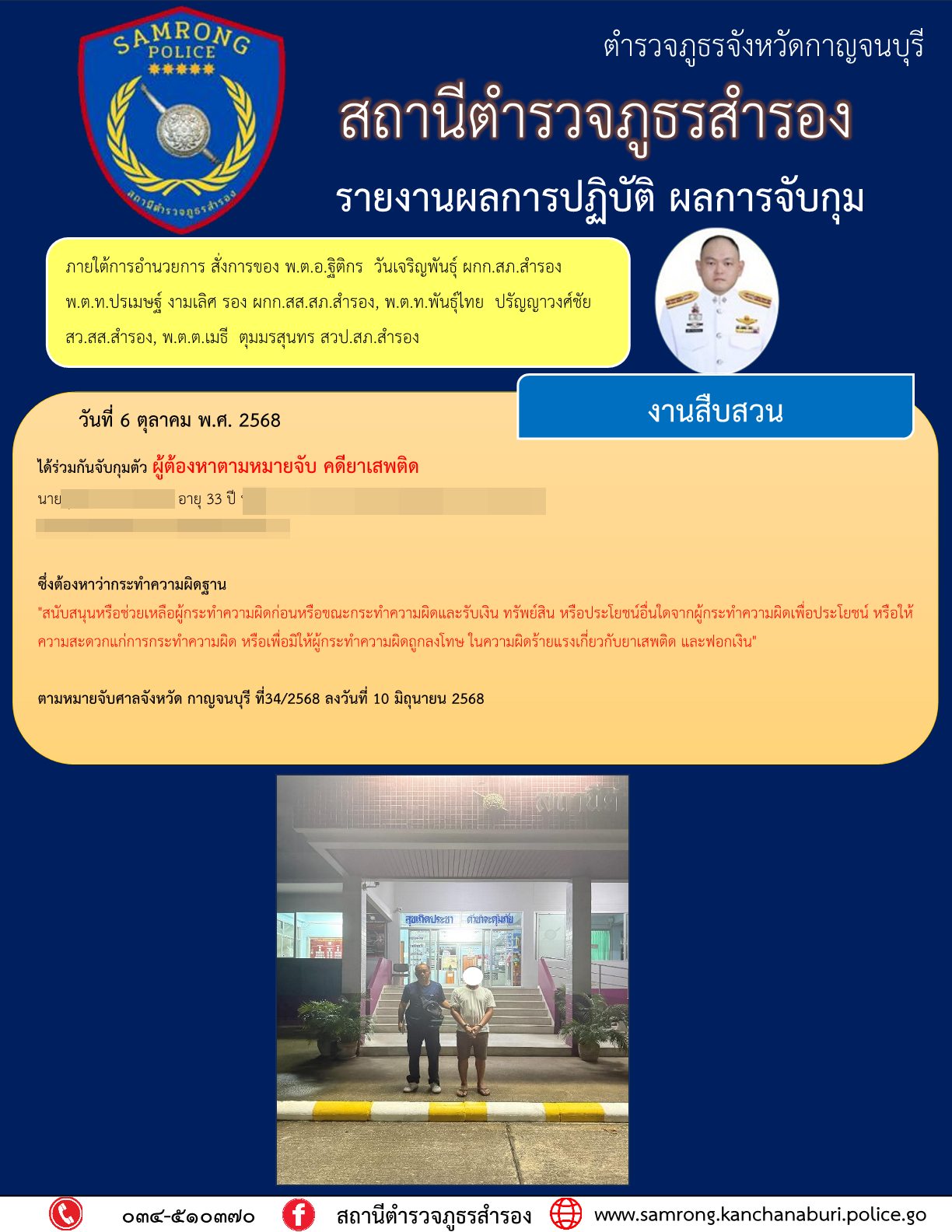 วันที่ 6 ต.ค 68งานสืบสวน สภ.สำรอง จับกุมผู้ต้องหาตามหมายจับ คดียาเสพติด