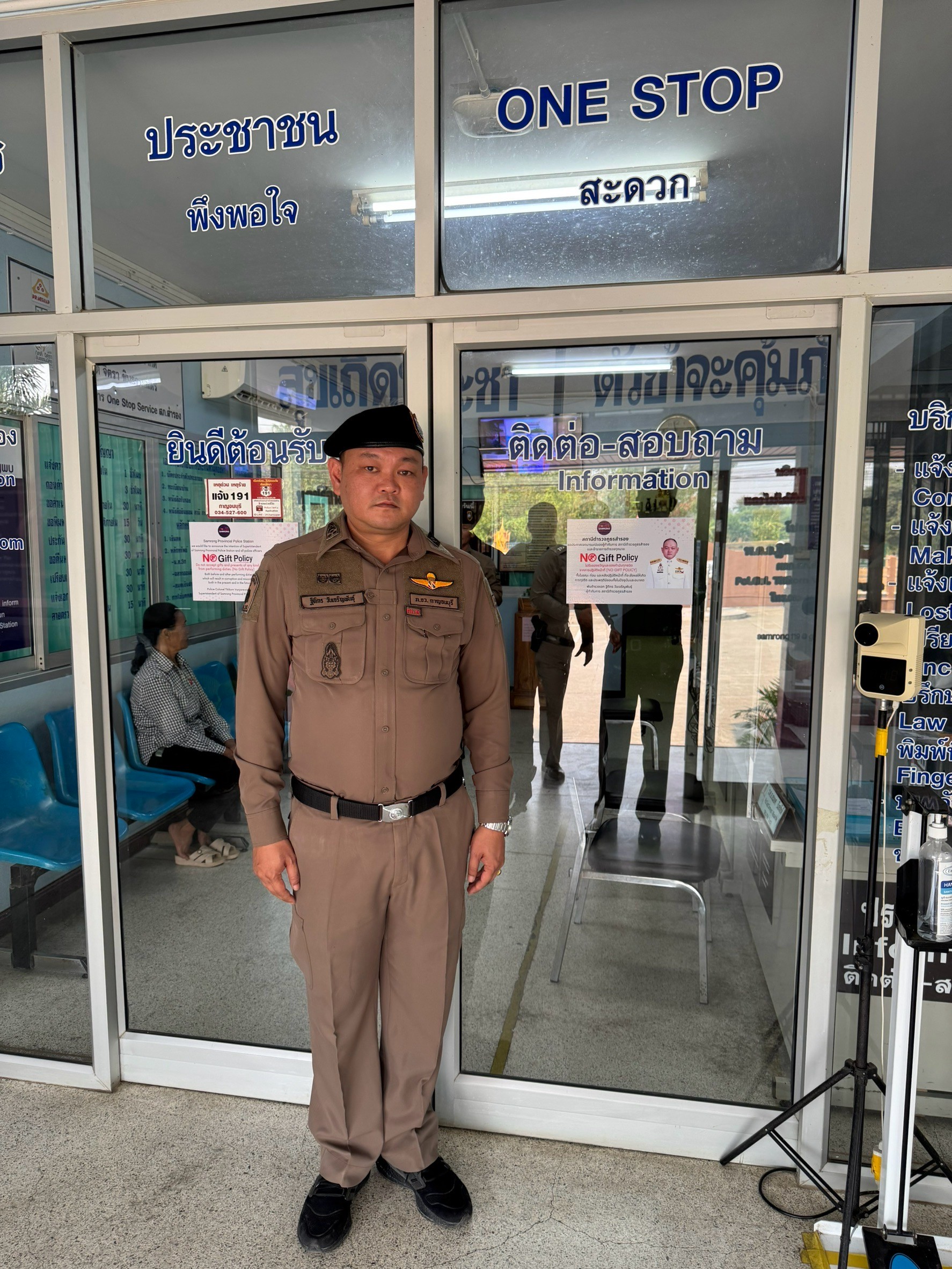 พ.ต.อ. ฐิติกร วันเจริญพันธุ์ ผกก.สภ.สำรอง ทำการติดตั้งป้ายประชาสัมพันธ์ ประกาศเจตจำนงสุจริต และ นโย