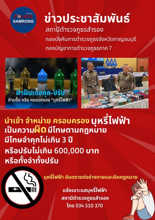 “บุหรี่ไฟฟ้า” อันตรายต่อสุขภาพผู้ใช้ และคนใกล้ชิด ผบ.ตร. สั่งคุมเข้ม บุหรี่ไฟฟ้า ย้ำกลุ่มเสี่ยงเด็กแ