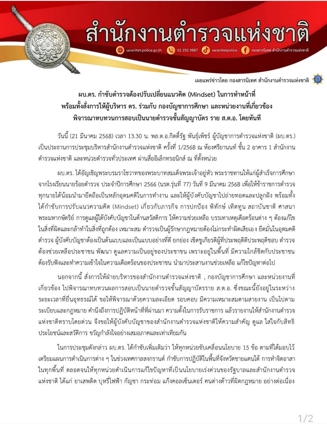 ผบ.ตร. กำชับตำรวจต้องปรับเปลี่ยนแนวคิด (Mindset) ในการทำหน้าที่ พร้อมทั้งสั่งการให้ผู้บริหาร ตร. ร่ว